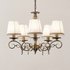 5-lamps kroonluchter Finnick met romantische charme De kroonluchter Finnick heeft een antiek messing frame dat de kroonluchter een elegant en romantisch karakter geeft met zijn sierlijke en artistieke lijnen. Vanuit het frame steken vijf armen naar de zijkanten. Hun gebogen vorm doet denken aan ranken van planten. Aan elk van de armen is een kap van wit textiel bevestigd, die voor een zachte en aangename lichtverdeling zorgt. Finnick slaat een bijzonder goed figuur boven een eettafel en creëert een gezellige maar stijlvolle sfeer in de kamer.